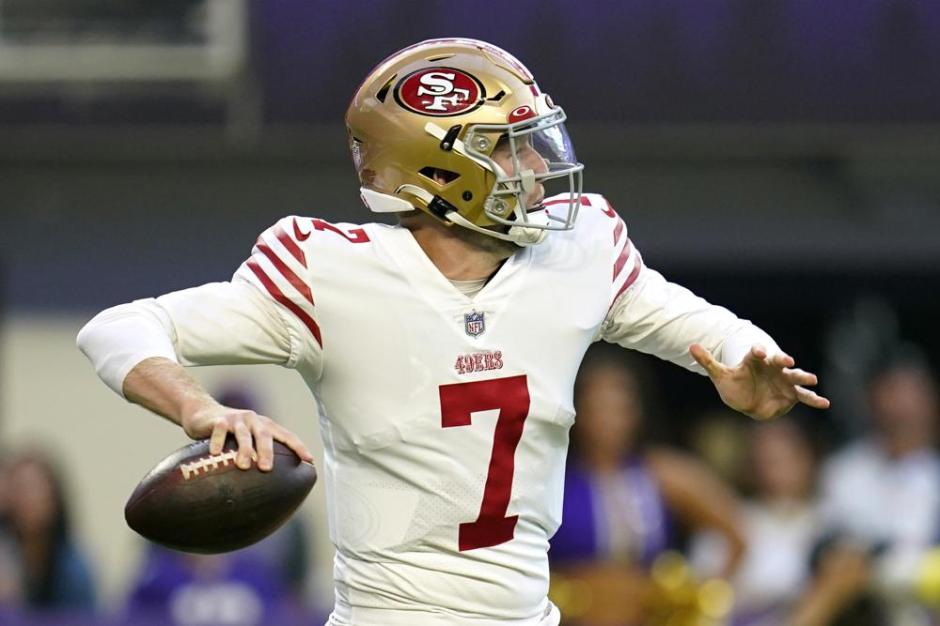 San Francisco 49ers quarterback Nate Sudfeld (7) prepares to heave one against the Minnesota Vikings defense on Sat Aug 20, 2022 at US Bank Stadium in Minneapolis (AP News photo)