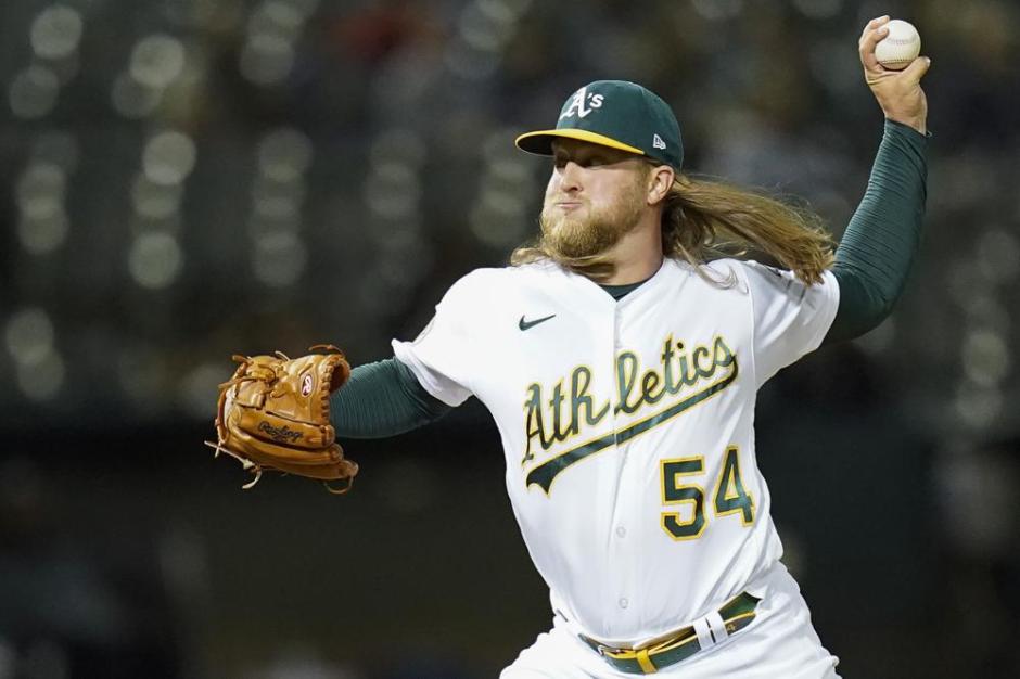 Oakland Athletics’ Kirby Snead pitches against the Miami Marlins in the top of the ninth at the Oakland Coliseum on Tue Aug 23, 2022 (AP News photo)