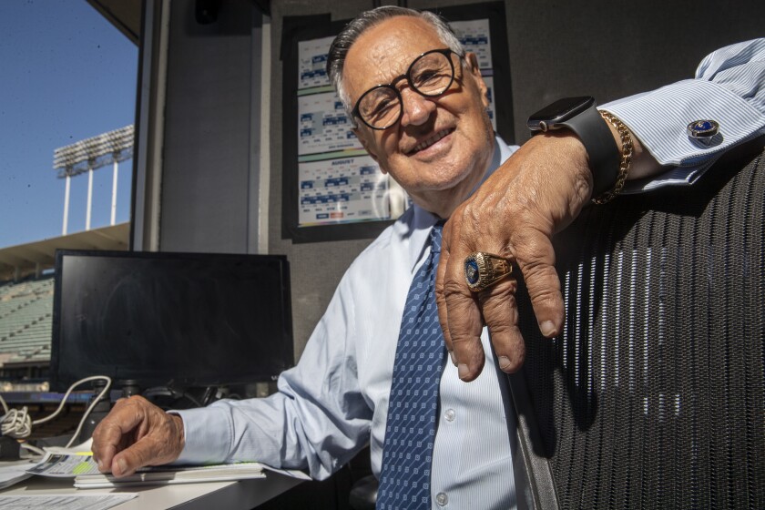 Los Angeles Dodger Spanish announcer Jaime Jarrin in his broadcast booth at Dodgers Stadium is good friends with Oakland A’s Spanish announcer Amaury Pi Gonzalez. Jarrin broadcasted Dodger baseball in Spanish from beginning to end of his career. (file photo Los Angeles Times)