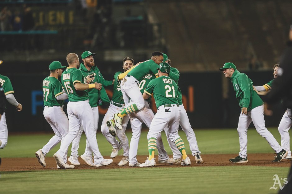 Oakland A’s Tony Kemp (5) jumps on the back of Chad Pinder (10) after Pinder hits a ground ball to Yankee shortstop Isiah Kiner-Falefa who throws it away to first base and allows ghost runner Shea Langeliers to score from second base in the bottom of the 11th inning at the Oakland Coliseum on Sat Aug 27, 2022 (@Athletics photo)