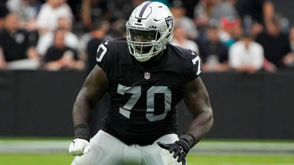 Former Las Vegas Raiders 2021 first round offensive lineman Alex Leatherwood was cut from the Raiders this week (file photo nfl.com)