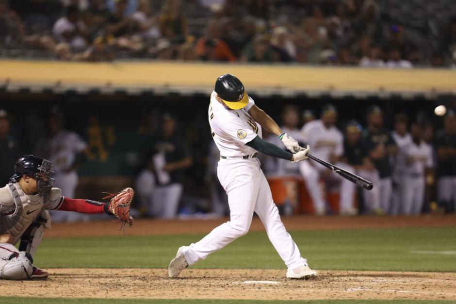 The Oakland A’s Chad Pinder swings for the fences connecting for a three run home run in the bottom of the fifth inning at the Oakland Coliseum against the Atlanta Braves Tue Sep 6, 2022 (AP News photo)
