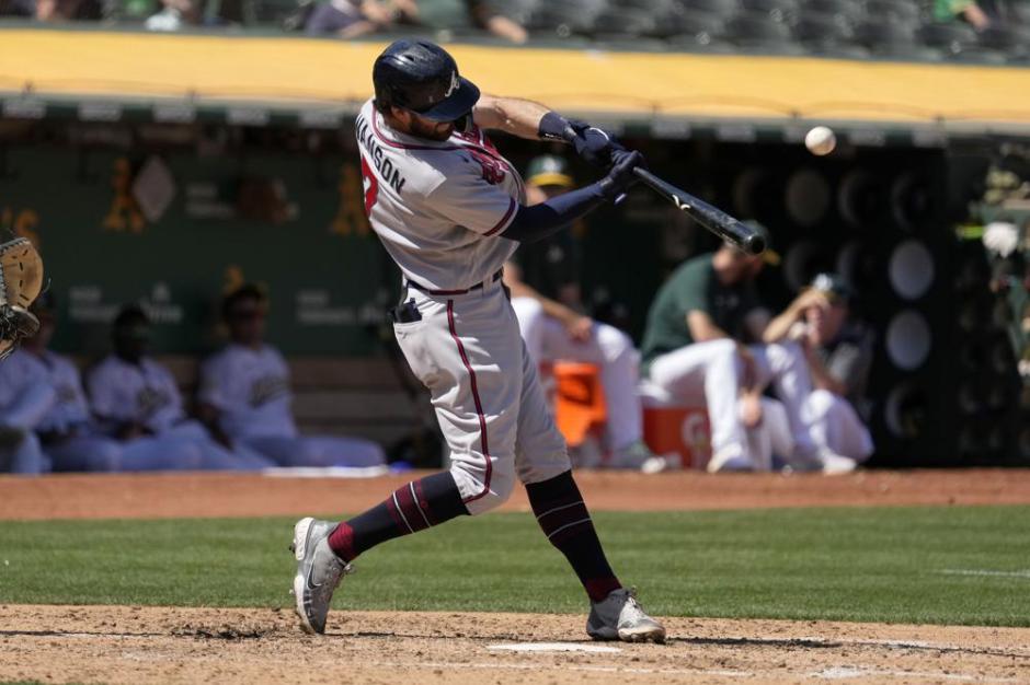 Dansby Swanson of the Atlanta Braves hits a solo shot in the top of the sixth inning at the Oakland Coliseum against the Oakland A’s on Wed Sep 7, 2022 (AP News photo)