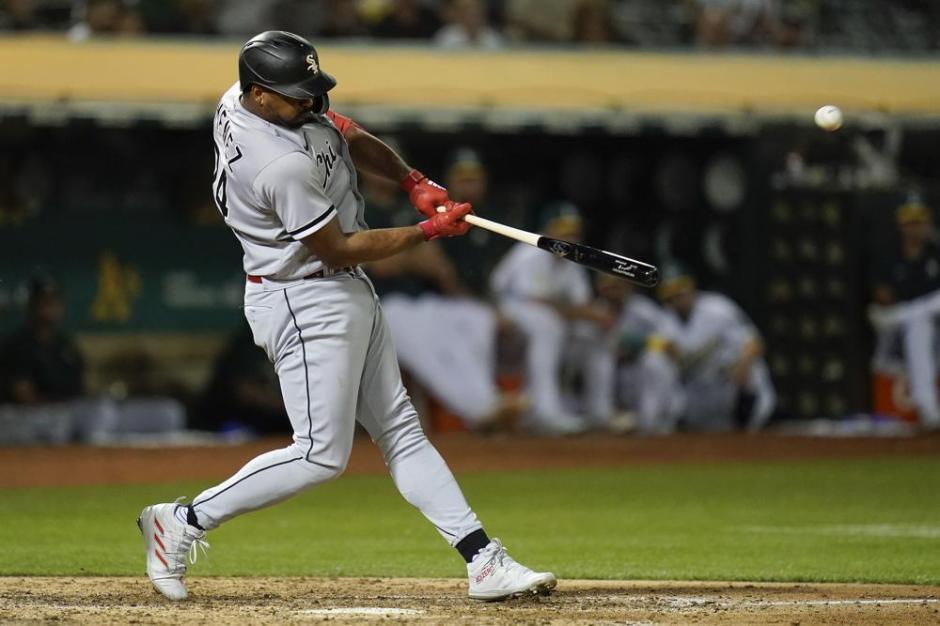 Chicago White Sox’s Eloy Jiménez belts a two run homer in the top of the sixth inning at the Oakland Coliseum against the Oakland A’s on Thu Sep 8, 2022 (AP News photo)