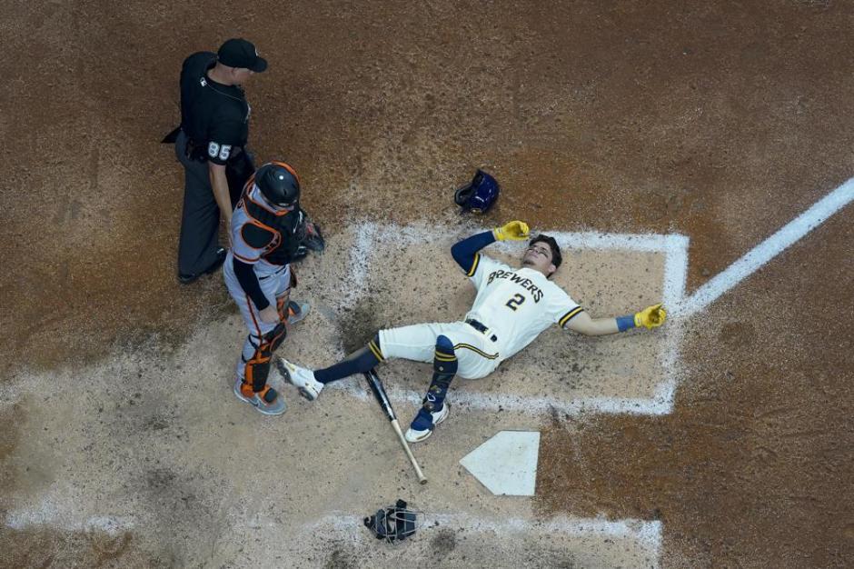 Milwaukee Brewers Luis Urias is laid out after getting beaned by a San Francisco Giants pitch in the bottom of the sixth inning at American Family Stadium in Milwaukee Thu Sep 8, 2022 (AP News photo)