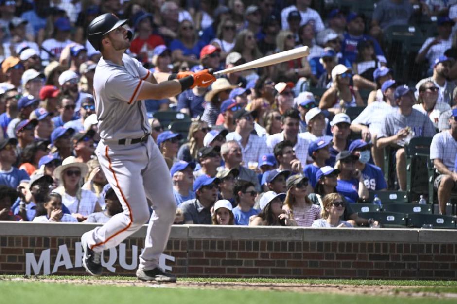 San Francisco Giants catcher Joey Bart swings for a two run home run against the Chicago Cubs at Wrigley Field Chicago in the bottom of the second inning (AP News photo)