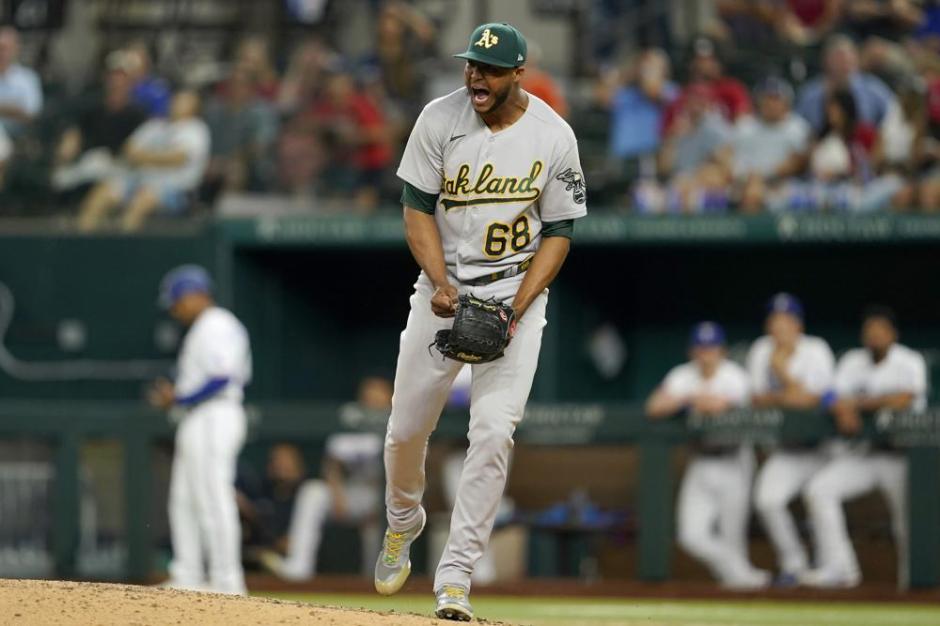 Oakland A’s closer Domingo Acevedo shuts the door on the Texas Rangers in the bottom of the ninth for the win at Choctaw Stadium in Arlington on Wed Sep 14, 2022 (AP News photo)