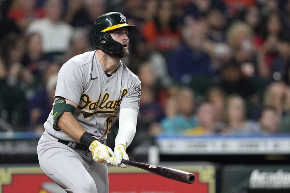 Oakland A’s Seth Brown wallops a three run home run in the top of the fifth off Houston Astros pitching at Minute Maid Field in Houston Sat Sep 17, 2022 (AP News photo)