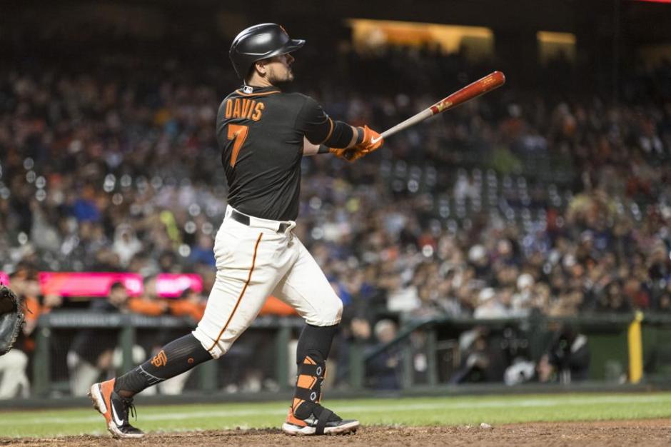 The San Francisco Giants JD Davis connects for RBI double against the Los Angeles Dodgers at Oracle Park in San Francisco on Sun Sep 18, 2022 (AP News photo)