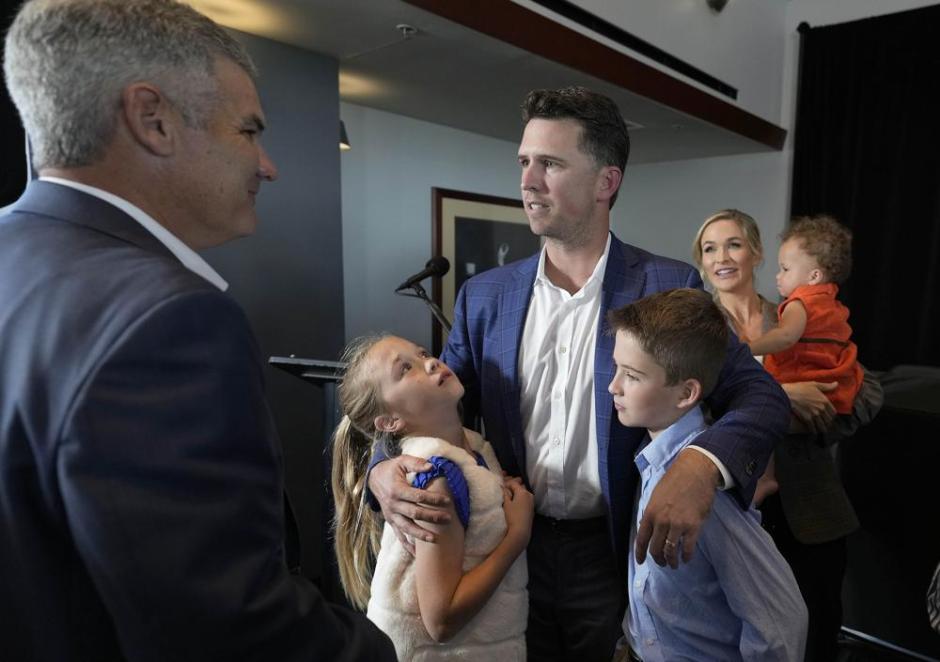 San Francisco Giants catcher Buster Posey talks with a friend as he hugs his children Addison and Lee with his wife, Kristen, right, Thu Nov 4, 2021 Posey said he was retiring from baseball but has announced he is joining the Giants ownership team as of Tue Sep 20, 2022 (AP News file photo)