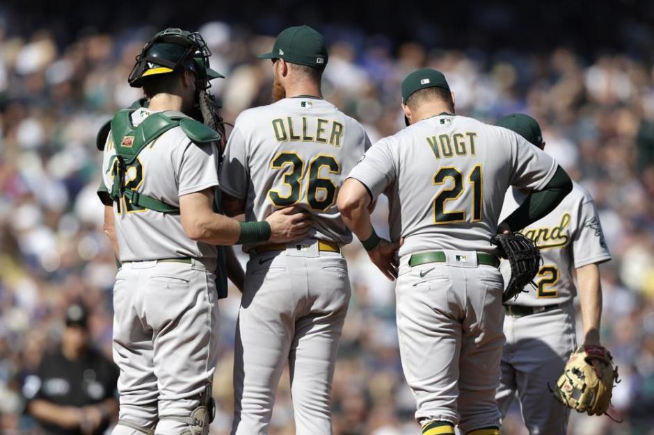 Starter Adam Oller is surrounded by Oakland A’s teammates after giving up a top of the first inning run to the Seattle Mariners at T Mobile Park in Seattle on Sat Oct 1, 2022 (AP News photo)
