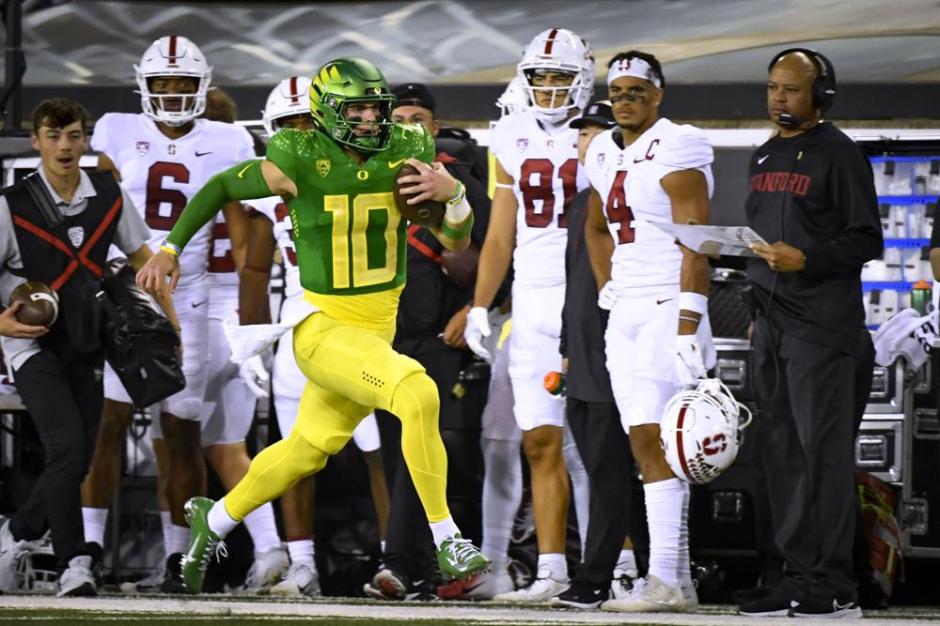 The looks on the Stanford Cardinal sideline says it all as the Oregon Ducks quarterback Bo Nix takes a keeper for long yardage. Nix wound up with four touchdowns on the day to defeat Stanford at Autzen Stadium in Eugene on Sat Oct 1, 2022 (AP News photo)