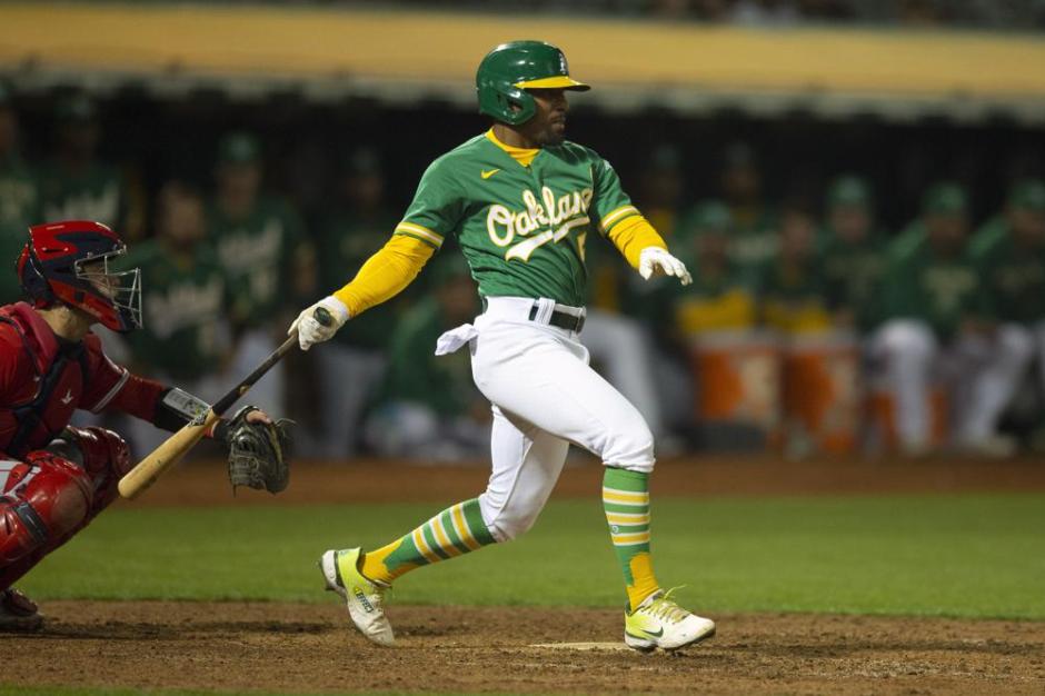 Oakland A’s Tony Kemp (5) swings for a RBI single in the bottom of the tenth scoring the game winning run at the Oakland Coliseum on Mon Oct 3, 2022 against the Los Angeles Angles (AP News photo)
