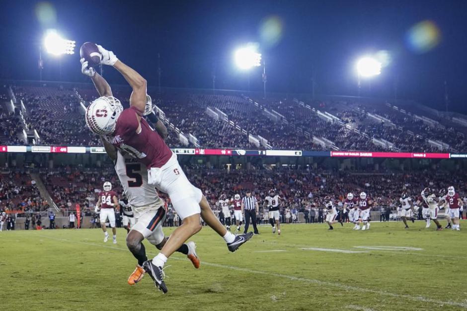 Stanford wide receiver Brycen Tremayne (81) catches a 21-yard touchdown over Oregon State defensive back Alex Austin (5) during the first half action at Stanford Stadium on Sat Oct 8, 2022. The Cardinal face the Notre Dame Fighting Irish this Sat Oct 15, 2022 (AP News photo)