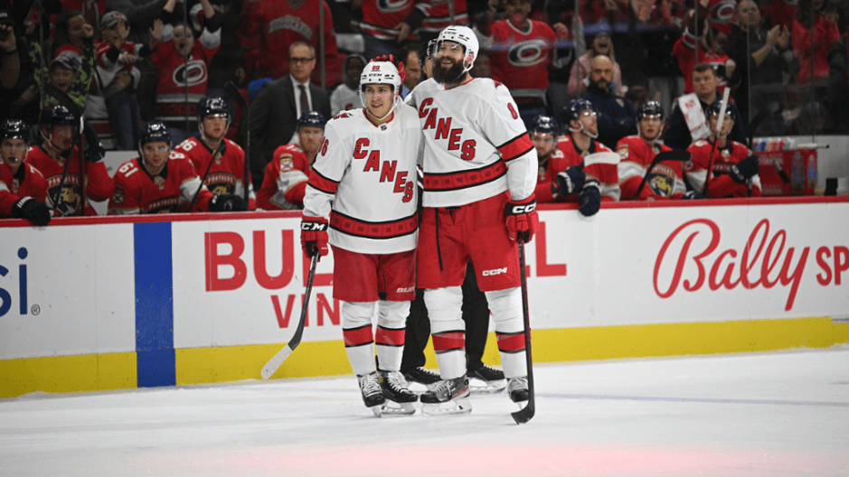 Brent Burns (right) of the Carolina Hurricanes will be skating against his old teammates the San Jose Sharks tonight at the SAP Center in San Jose in the Sharks home opener (photo by the Carolina Hurricanes)