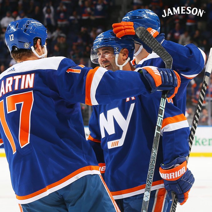 The New York Islanders had plenty to celebrate on Tue Oct 18, 2022 defeating the San Jose Sharks at UBS Arena in Belmont (@jamesonwhiskey photo)