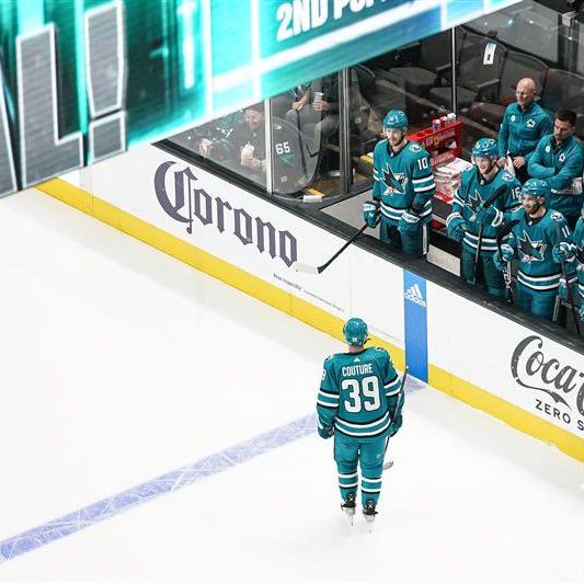 Photo credit to San Jose Sharks twitter. Sharks Logan Couture skates by the bench while the Sharks goal horn goes off at SAP Center in San Jose on Sat Oct 29, 2022