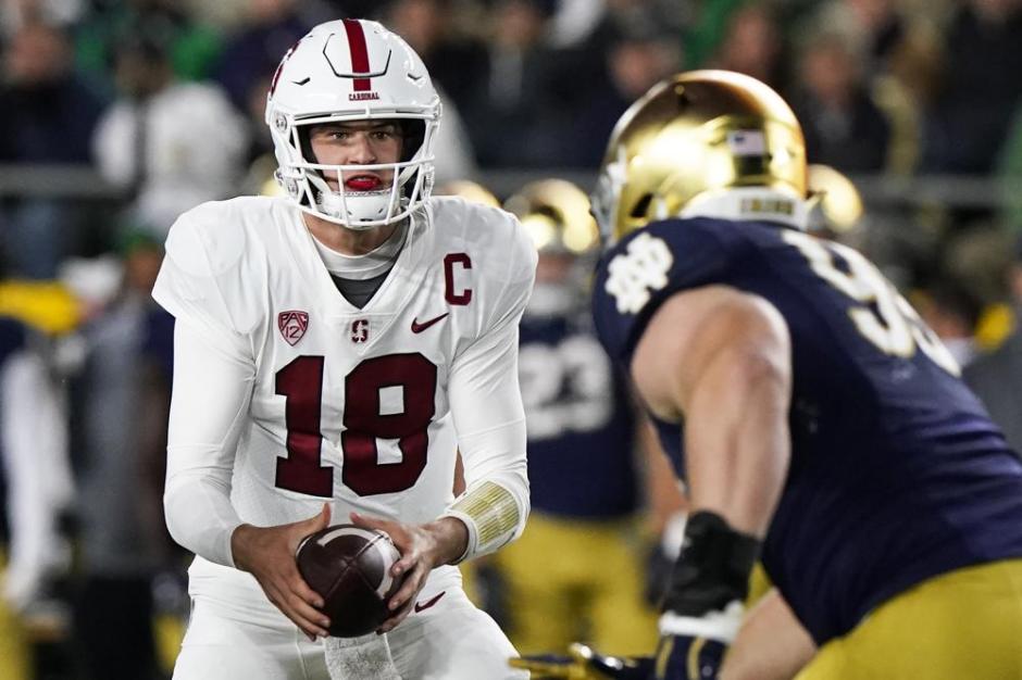 Tanner McKee (18) quarterback for the Stanford Cardinal hopes to not look like a deer in the headlights here he is being rushed by a Notre Dame Fighting Irish lineman on Sat Oct 15, 2022. The Cardinal take on the UCLA Bruins tonight in Los Angeles (AP News photo)