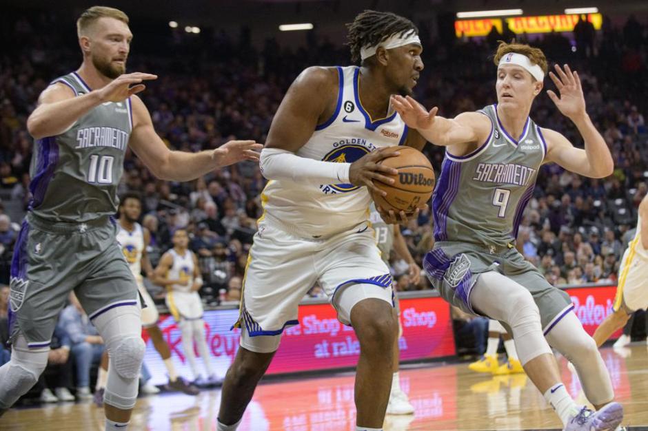 Golden State Warriors center Kevon Looney, center, is guarded by Sacramento Kings forward Domantas Sabonis (10) and guard Kevin Huerter (9) during the first quarter at Golden 1 in Sacramento on Sun Nov 13, 2022 (AP News photo)