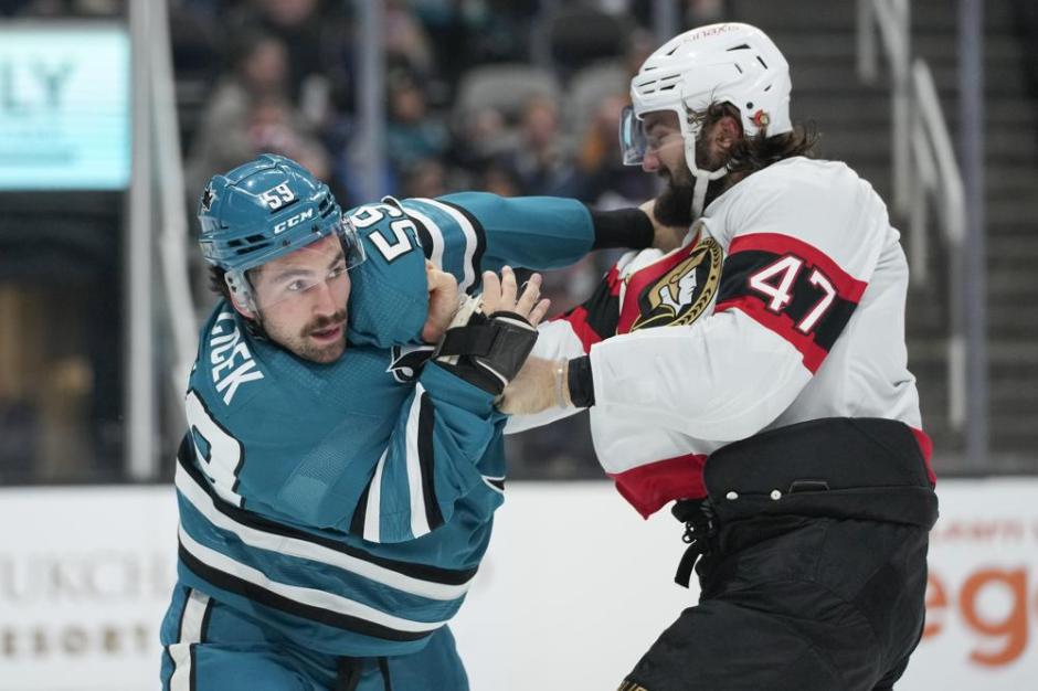 Ottawa Senators center Mark Kastelic (47) punches San Jose Sharks defenseman Nick Cicek during the second period at SAP Center in San Jose on Mon Nov 21, 2022 (AP News photo)