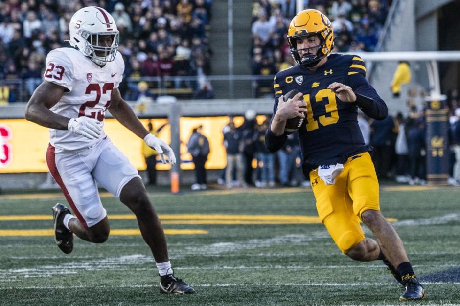 Cal Bears quarterback Jack Plummer (13) makes a run for it from Stanford Cardinal fullback Jacob Lowe (23) at Cal Memorial Stadium in Berkeley on Sat Nov 19, 2022 (AP News photo)