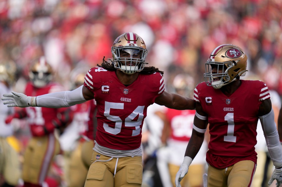 San Francisco 49ers Fred Warner and Jimmie Ward celebrate a defensive stop at Levi’s Stadium on Sunday NOV 27, 2022. (San Francisco 49ers)