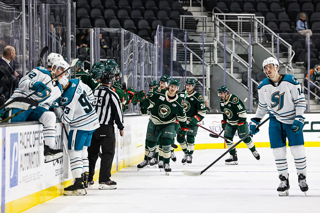 The Iowa Wild celebrate a goal along the bench against the San Jose Barracuda at Tech CU Arena on Tuesday NOV 29, 2022. (San Jose Barracuda)