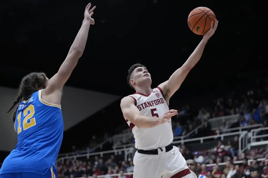 Stanford guard Michael O’Connell (5) shoots next to UCLA forward Mac Etienne (12) during the first half at Maples Pavilion in Palo Alto on Thu Dec 1, 2022 (AP News photo)