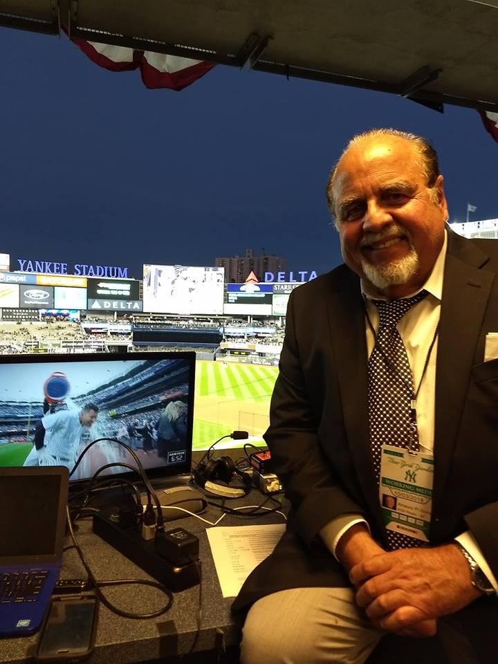 The author Amaury Pi Gonzalez prepares for doing the Oakland A’s Spanish radio broadcast at Yankee Stadium on Oct 3, 2018 against the New York Yankees for the American League Wild Card game (photo from Amaury Pi Gonzalez)