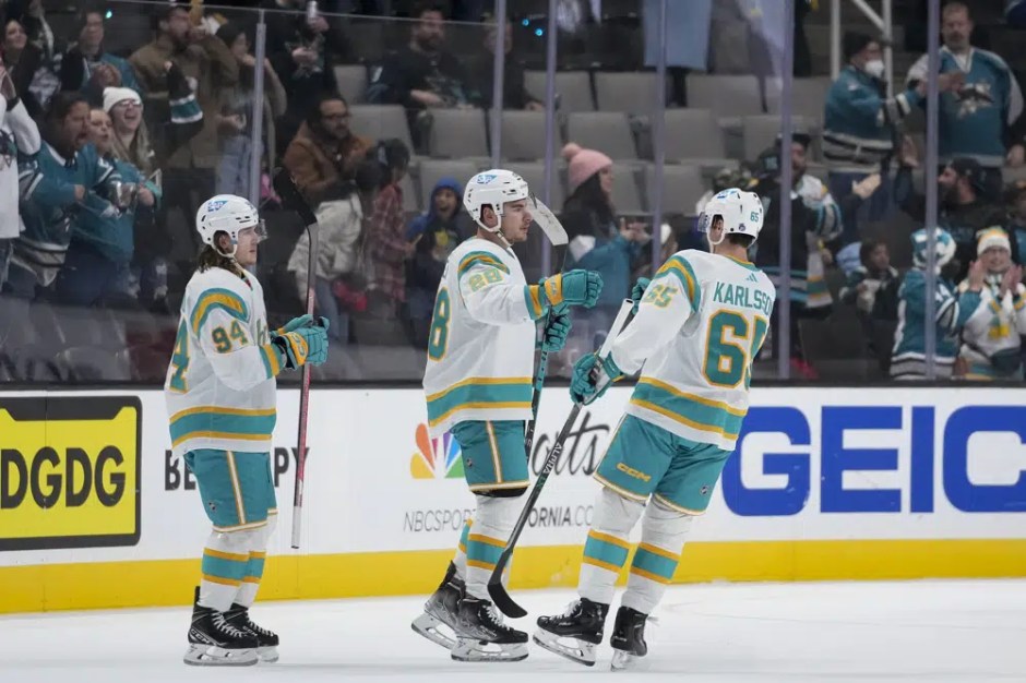 San Jose Sharks right wing Timo Meier (28) celebrates with defenseman Erik Karlsson (65) after scoring a goal against the Vancouver Canucks during the second period at the SAP Center in San Jose on Wed Dec 7, 2022 (AP News photo)