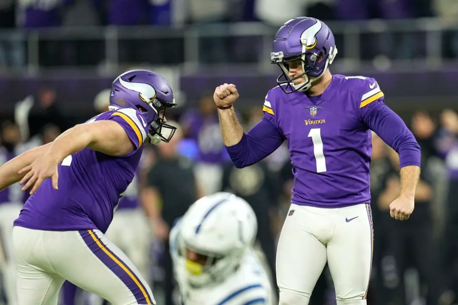 Minnesota Vikings place kicker Greg Joseph (1) celebrates after kicking a 40-yard field goal during overtime against the Indianapolis Colts in Minneapolis on Sun Dec 11, 2022 (AP News photo)