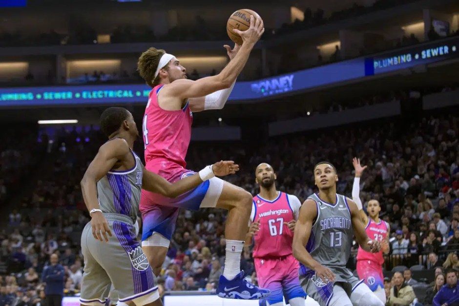 Washington Wizards forward Corey Kispert, second from left, drives to the basket past Sacramento Kings guard De’Aaron Fox during the first quarter at Golden 1 Center in Sacramento on Fri Dec 23, 2022 (AP News photo)