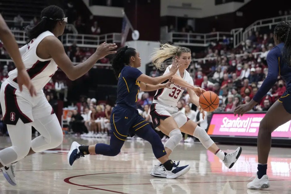 Stanford guard Hannah Jump (33) passes the ball while defended by California guard Leilani McIntosh during the first half at Maples Pavilion in Palo Alto on Fri Dec 23, 2022 (AP News photo)
