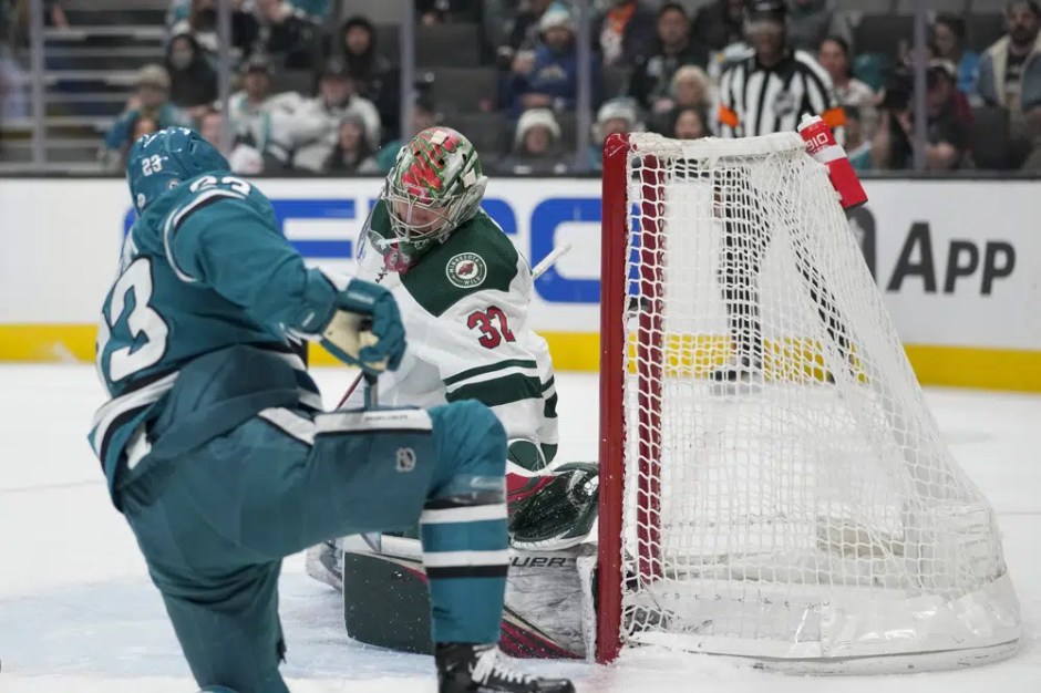 Minnesota Wild goaltender Filip Gustavsson (32) is unable to stop a shot by San Jose Sharks left wing Oskar Lindblom, foreground, for a goal during the second period at SAP Center on Thu Dec 22, 2022 (AP News photo)
