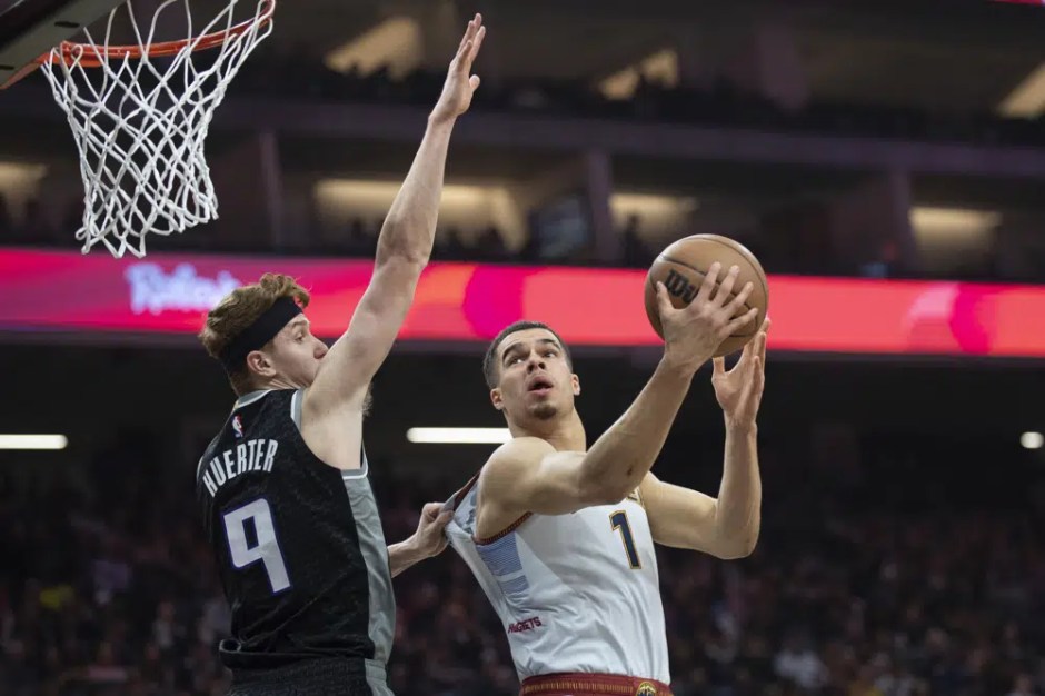 Denver Nuggets forward Michael Porter Jr. (1) scores a basket while defended by Sacramento Kings guard Kevin Huerter (9) in the first quarter at Golden 1 Center in Sacramento on Tue Dec 27, 2022 (AP News photo)