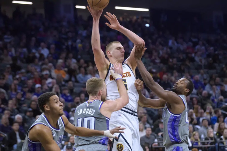 Denver Nuggets center Nikola Jokic is guarded by Sacramento Kings forward Domantas Sabonis and Harrison Barnes during the first quarter at Golden 1 Center in Sacramento on Thu Dec 29, 2022 (AP News photo)