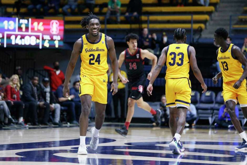 The Cal Bears forward Sam Alajiki (24) had lots to smile about as he takes the ball up court against the Stanford Cardinal on Fri Jan 6, 2023 at Haas Pavilion (San Francisco Chronicle photo)