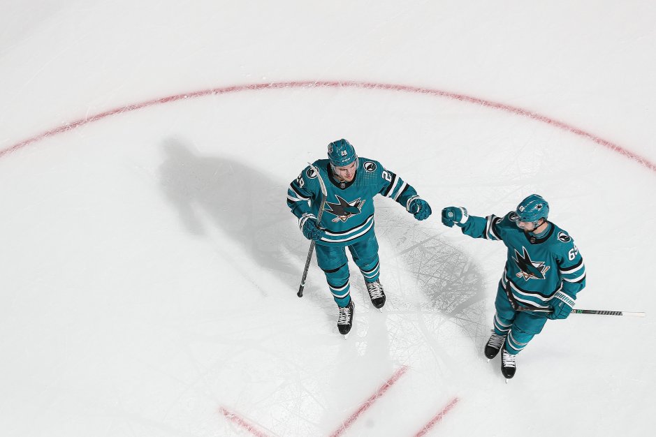 Photo courtesy of San Jose Sharks Twitter. Timo Meier and Erik Karlsson celebrate a goal on January 18th against the Dallas Stars.