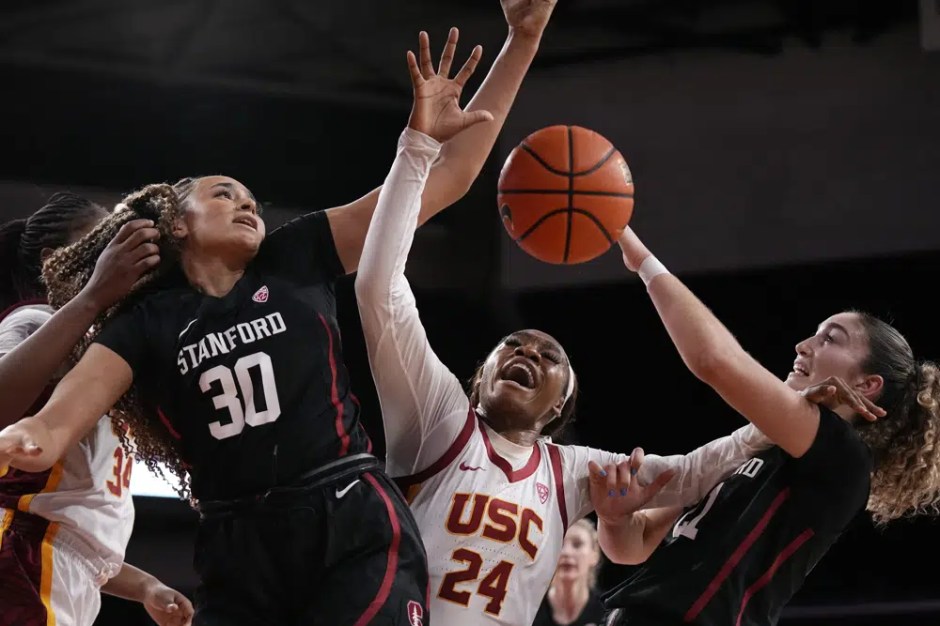 Stanford guard Haley Jones (30) and forward Brooke Demetre (21) grapple for a loose ball with Southern California guard Okako Adika (24) during the first half at USC in Los Angeles on Sun Jan 15, 2023 (AP News photo)