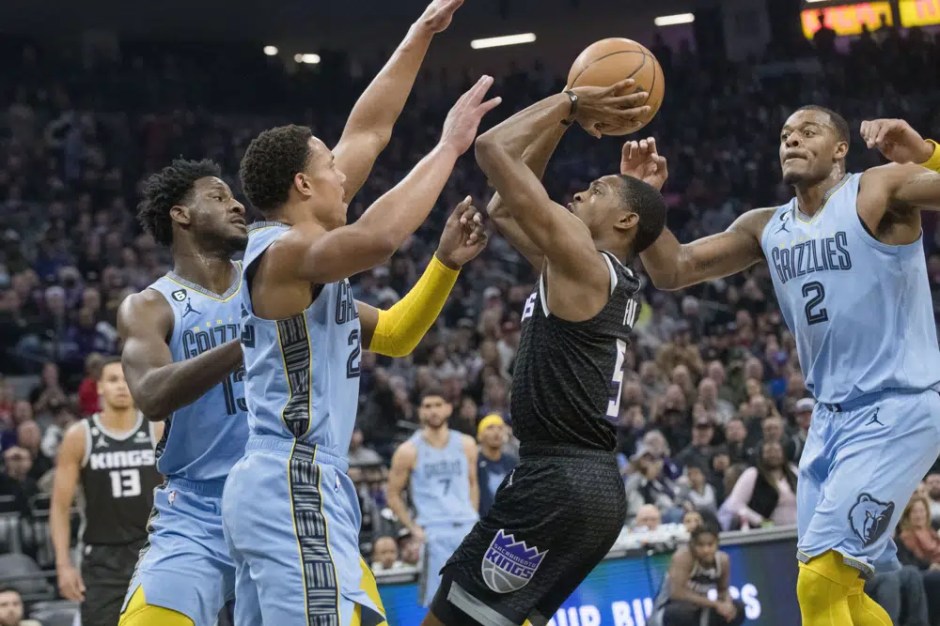 Memphis Grizzlies forward Jaren Jackson Jr., left, and Desmond Bane, second from left, guard against Sacramento Kings guard De’Aaron Fox, second from right, during the first quarter at Golden 1 Center in Sacramento on Mon Jan 23, 2023 (AP News phot)