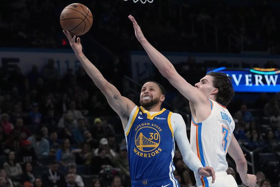 Warriors guard Stephen Curry (30) shoots in front of Oklahoma City Thunder guard Josh Giddey (3) in the first half at the Paycom Center in Oklahoma City on Mon Jan 30, 2023 (AP News photo)