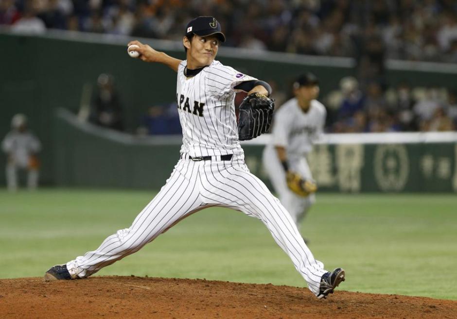 Japan pitcher Shintaro Fujinami pitches against the Netherlands in the sixth inning of an international exhibition series baseball game at Tokyo Dome in Tokyo, Nov. 12, 2016. Right-hander Fujinami (AP News file photo)