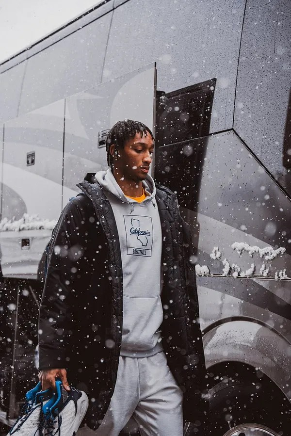 Cal Bears guard Joel Brown shoes in hand heads for the tarmac and boards a plane at Salt Lake City after playing the Utah Utes on Sun Feb 5, 2023 (@CalMBBall photo)