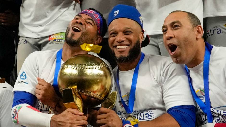 Robinson Canó (center) and teammates pose with the championship trophy on Fri Feb 10, 2023. (Ariana Cubillos/AP)