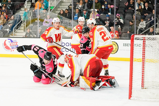 Calgary (33-11-2-0) drew first blood late in the first period. Emilio Pettersen point blank chance was initially saved by ‘Cuda goalie Eetu Makiniemi but the rebound was tucked home by Kevin Rooney for his third goal of the season at the 18:49 mark.