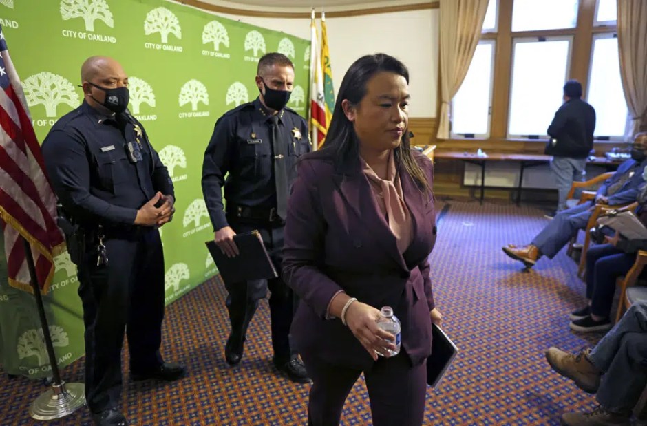 Oakland Mayor Sheng Thao walks away from the podium after addressing the media on the firing of Oakland police chief LeRonne Armstrong on Wed Feb 15, 2023 at Oakland City Hall. The Oakland A’s who are seeking funding for the Howard Terminal project is grant money that Thao is trying to identify. (AP News photo)