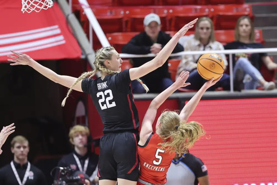 Stanford forward Cameron Brink (22) blocks the shot of Utah guard Gianna Kneepkens (5) in the first half in Salt Lake City on Sat Feb 25, 2023 (AP News photo)