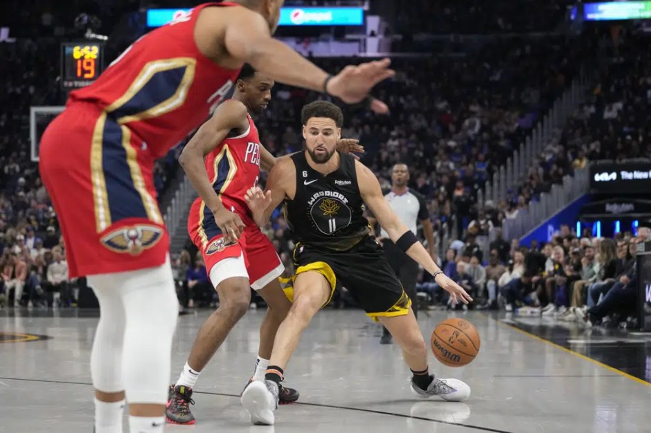 Golden State Warriors guard Klay Thompson (11) tries to get past New Orleans Pelicans forward Herbert Jones during the first half at Chase Center in San Francisco on Fri Mar 3, 2023 (AP News photo)
