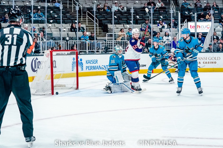 With just over two minutes left in the second period, the Blue Jackets stung again. San Jose turned over the puck in their defensive zone, which led to Columbus’ center Boone Jenner (38) getting a shot from the inside of the right circle that ended up in the Sharks net through the Sharks screen. Sharks goaltender Kaapo Kahkonen (36) can’t make the save with Sharks defenseman Erik Karlsson (65) and the Jackets right winger Emil Bemstrom (52) in front of the net (photo by INDUSATV)