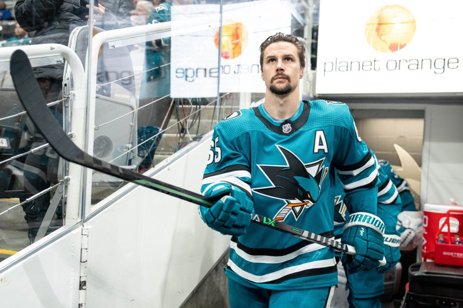 Photo courtesy of San Jose Sharks Twitter. Erik Karlsson walks out on to the ice for warmups.
